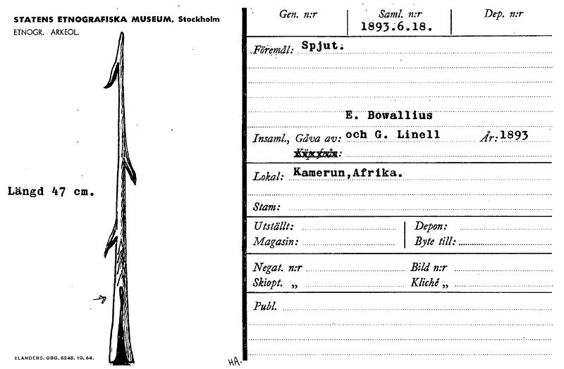 • STATENS ETNOGRAFISKA MUSEUM, Stockholm ETNOGR. ARKEOL. Gen. n:r Sam/. n:r I Dep. n:r 1893 :6.18 . .Föremål: Spjut E. Bowaii tus Insaml., Gåva av: • och G. Linell År:1893 ~få : Lokal: Kamerun , Afr ... Visa hela