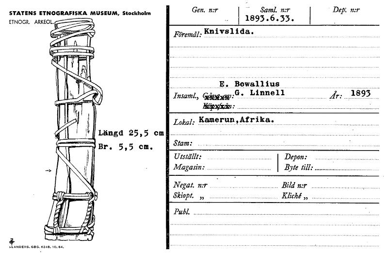 • STATENS ETNOGRAFISKA MUSEUM, Stockholm ETNOGR. ARKEOL. Gen. n:r Saml. n:r I Dep: n:r 1893.6.33. Föremål: Knivslida. E. Bowallius År: 1893 imum4 GkmxmnG. Linnell mingszka' Lokal: Kamerun,Afrika. Längd... Visa hela