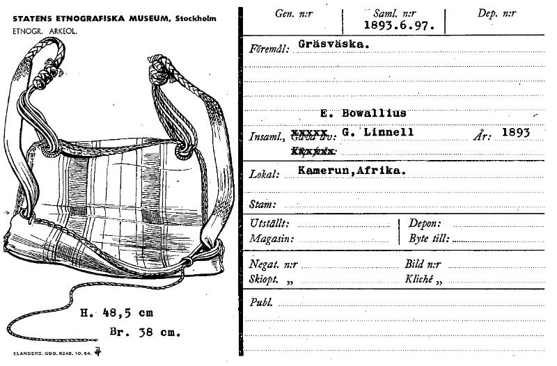 • STATENS ETNOGRAFISKA MUSEUM, Stockholm ETNOGR. ARKEOL. Gen. n:r Saml. n:r Dep. n:r 1893.6.97. I Föremål: Gräsväska. E. Bowallius Insaml,Mg WE. v: G. Linnell År: 1893 Lokal: Kamerun,Afrika. Stain: N... Visa hela
