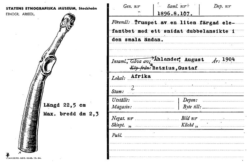 STATENS ETNOGRAFISKA MUSEUM, Stockholm ETNOGR. ARKEOL. Längd 22,5 cm Max. bredd dm 2,3 Saml. 1896.8.107. Föremål: Trumpet av en liten färgad ele- fantbet med ett snidat dubbelansikte i den smala ändan...