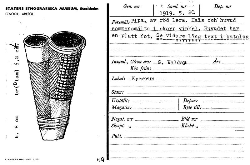 STATENS ETNOGRAFISKA MUSEUM, Stockholm ETNOGR. ARKEOL. Gen. n:rI` Sand. mr Dep. n:r I 1919. 5, 2Q Föremål: PiPa,. av töd lera,. Hals och' huvud ify "aammansmälta vinkel... Huvudet har .en_platt fot. Se vidare nng text i..-katalog 9 TTTT 9 TT Insaml., Gåva av: G. Waldap Köp från: År: Lokal: Kamerun Stam: Utställt: Depon: Magasin: I Byte till: Negat. n:r Bild n:r Skiopt. „ Kliche „ Publ. ELANDERS. 080. 8503. 5. 65. [ocr]