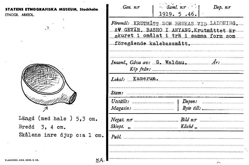 STATENS ETNOGRAFISKA MUSEUM, Stockholm ETNOGR. ARKEOL. Längd (med hals ) 5,3 cm. Bredd 3, 4 cm. Skålens inre djup c:a 1 cm. • Gen. n:r I-. -Sami. n:r I Dep. n:r 1919. 5 .46.1 KRUTMÅT T S OM BRUKAS VID LAMNI g G AV GEVÄR. .BASHO I ANYANG..Krutmåttet är skuret i omålat i trä i SaMMa_f Orm spm föregående kalebassmått. Insaml„ Gåva av: G. Waldau. År: Köp från: Lokal: Kamerun. Stam: Utställt: I Depon: Magasin: Byte till: Negat. n:r Bild n:r Skiopt. „ Kliché,, Publ. ELANDERS. GBG. 8509. 5. 65. ti A. [ocr]Stäng