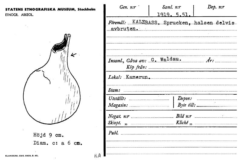 STATENS ETNOGRAFISKA MUSEUM, Stockholm ETNOGR. ARKEOL. fl Höjd 9 cm. Diam. c: a 6 cm. Gen. n:r I Sanzl. n:r I Dep. n:r I 1919. 5.51. Föremål: KADEI3ASS.. Sprucken., halsen delvis. avbruten., Insaml., Gåva av: G, Waldau• Köp från: Lokal: Kamerun, Stam: Utställt: I Depon: Magasin: I Byte till: Negat. n:r Bild n:r Skiopt. „ Kliché,, Publ. År: ELANDERS. GBG. 6503.5. 85. HA [ocr]