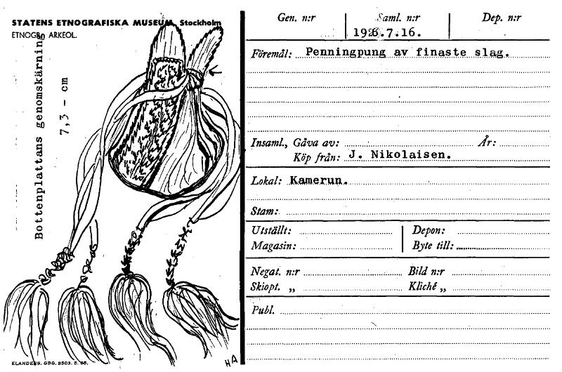 • Dep. n:r Gen. n:r I •Yaml. n:r 1196.7.16. Föremål: Penningpung av finaste slag. Insaml., Gåva av: Köp från: J. Nikolaisen. Lokal: Kamerun. Stam:. Utställt: I Depon: Magasin: I Byte till: Negat.... Visa hela