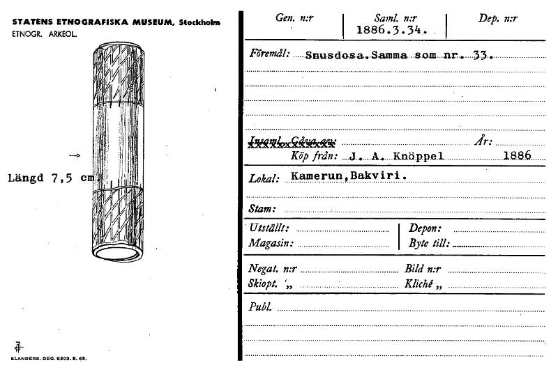 • STATENS ETNOGRAFISKA MUSEUM, Stockholm ETNOGR. ARKEOL Gen. n:r Saml. n:r I Dep. n:r 1886.3.34. Föremål: Snusdosa. Samma som nr . 33. keKtkix.241~ År: Köp från: 1.8.8 6 Lokal: Kamerun , Bakv i r i . ... Visa hela