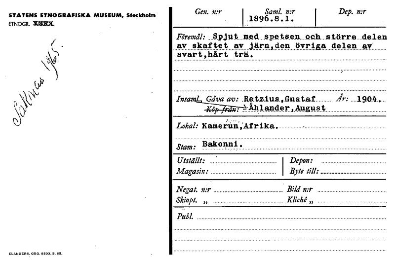 Gen. n:r Saml. n:r • 1896.8.1. Dep. n:r STATENS ETNOGRAFISKA MUSEUM, Stockholm ETNOGR. WiML. Föremål:S pj t_ med spe tesen_ och_stdrra _delen av skaftet av j äril, den övriga delen av' svart , hårt trä. /mang,...pdva av: tz i us , Gus taf 1904 . R 1- 44m7464 rull ande r Augus t Lokal: Hamerån., Af r ika Stam: Bakonni. Utställt: I Depon: Magasin: I Byte till: Negat. n:r Bild n:r Skiopt. „ Kliché,, ELANDERS. GBG. 9503. 5. 65. [ocr]