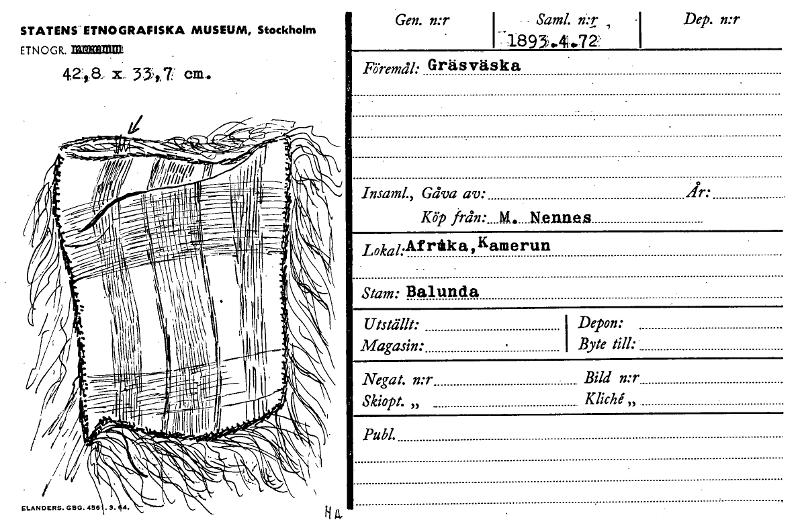 STATENS-ETNOGRAFISKA MUSEUM, Stockholm ETNOGR. MIIMM 4,218, x_ 33)L7 cm. ELANDERS. GBG. 436 Gen. n:r I_ Saml. n: , I 1895.4.72_ Dep. n:r Föremål: Gräsväska Insaml., Gåva av: År: Köp från: 14. N.ennes Lokal:Af rikka,Kamerun Stam: Balunda Utställt: Magasin: . I Depon: I Byte till:• Negat. n:r Bild n:r Skiopt. „ Kliché,, Publ. [ocr]