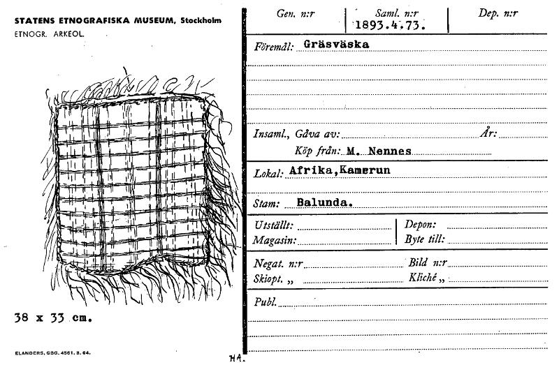 • STATENS ETNOGRAFISKA MUSEUM, Stockholm ETNOGR. ARKEOL. . 38 x 33 em. Gen. n:r i , Saml. n:r 1'1893.473. Dep. n:r Föremål: Gräsvåska Insaml„ Gåva av: År: Köp från:...M......Nennes Lokal: Afrika ,Kame... Visa hela