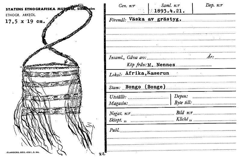 STATENS ETNOGRAFISKA MU ETNOGR. ARKEOL 17,5 x19 cm. ELANDERS. GRO. 4551.5.64. It Gen. n:r i I Saml. n:r I'? 1893.4.21. Dep. n:r Föremål: Väska av gräs tyg. Insaml., Gåva av: År: Köp från:14,. Nennes Lokal: Afrika,Kamerun Stam: Bongo (Bonge.) Utställt: I Magasin: Depon: I Byte till: Negat. n:r Bild n:r Skiopt. „ Kliché,, Publ. [ocr]
