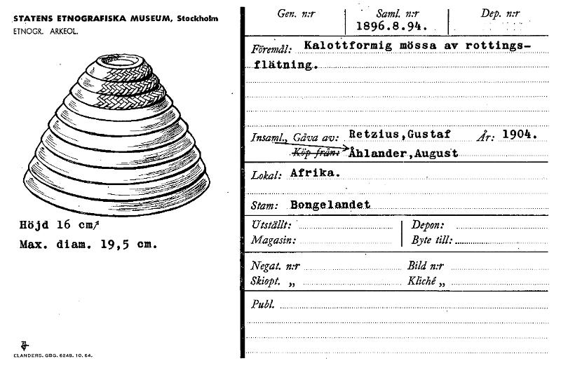 • ,STATENS ETNOGRAFISKA MUSEUM, Stockholm ETNOGR. ARKEOL. Höjd 16 em, Max. diam. 19,5 em. Gen. n:r- Saml. n:r Dep. n:r 1896.8.94. . Föremål: Kalot-tformig mössa av rottings— flätning. Insaml. Gåva av: ... Visa hela