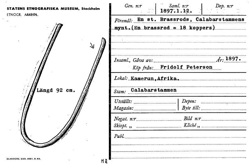 • STATENS ETNOGRAFISKA MUSEUM, Stockholm ETNOG R. AR-Kfet. ELANDERS. GAG. 456 I. 9. 64. Gen. n:r I - Saml. n:r i 1897a -.}g,.. -I Dep. n:r - - Föremål: En st. Brassrods , Calabarstammens ...aynt...(En_... Visa hela