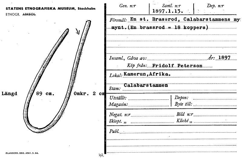 • STATENS ETNOGRAFISKA MUSEUM, Stockholm ETN 0 G R. ARKgQ6 Längd y: ELANDERS. GDG. 4561. 3. 64. Gen. n:r I - Sanil. n:r I 1897.1.13.. Dep. n:r Föremål: En st. Brassrod, Calabarstammens m mynt...(-En_ b... Visa hela