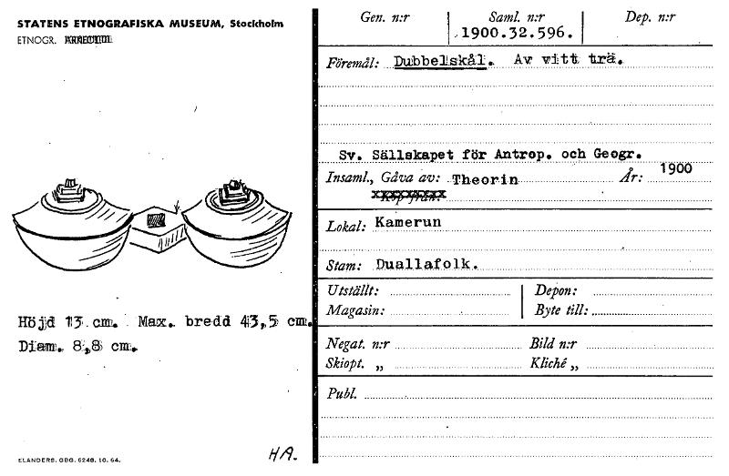 Gen. n:r STATENS ETNOGRAFISKA MUSEUM, Stockholm ETNOGR. Kumnmm Saml. n:r ,1900.32.596. Dep. n:r Föremål: Dubbelskäl. Av vitt- trä.. Sv. Sällskapet för Antrop. och Geogr. 26, 1900 XP;95:439PFX Insaml., Gåva av: Theori Lokal: Kamerun Stam: Duallafolk. Höjd 13. CM. - :Max.. bredd 43t, 5 CM* Dian. Depon: Byte till: Negat. n:r Bild n:r Skiopt. „ Kliche „ Utställt: Magasin: Publ. 6LANDERS. G8G. 6248. 10. 64. H4. [ocr]