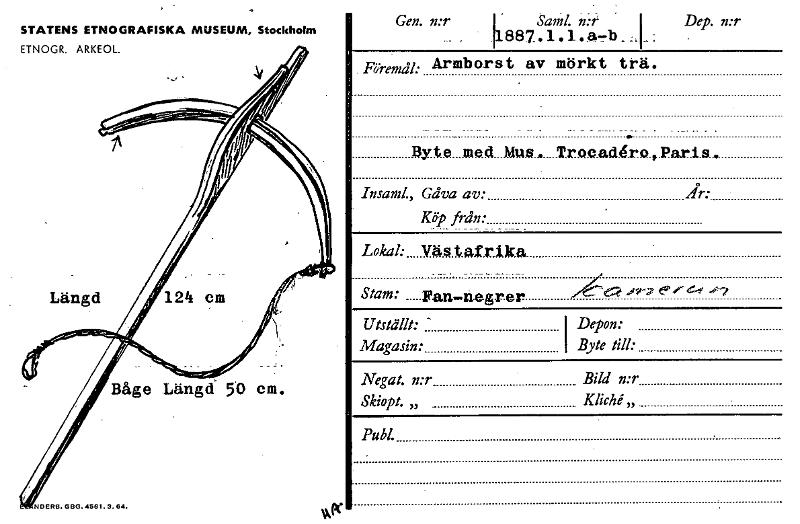 STATENS ETNOGRAFISKA MUSEUM, Stockholm ETNOGR. ARKEOL. Längd Båge Längd 50 cm. NDERS.GEW.45M3” Gen. n:r Sam!. n:r 11887.1.1.aT.b... , Dep. n:r .. Fbkeina. Armborst av mörkt trä. Byte med Mus. Trocaddro,Paris... Insaml„ Gåva av: År: Köp från: Lokah Vhstafrika Stam: Fan—negrer„c...4 d-,--.7 Utställt: - Magasin: Depon: Byte till: Negat. n:r Bild n:r Skiopt. „ Kliché,, Publ. [ocr]