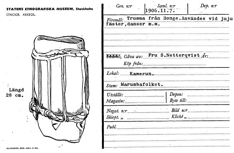 • STATENS ETNOGRAFISKA MUSEUM, Stockholm ETNOGR:. ARKEOL. Längd 28 cm. ELANDERS. GBG. 4561. 9. 84. Gen. n:rI Said. n:r 1906 .11:7 . . Dep. n:r I _ Föremål: Trumma från Bonge.Användes vid juj fäster,dans... Visa hela