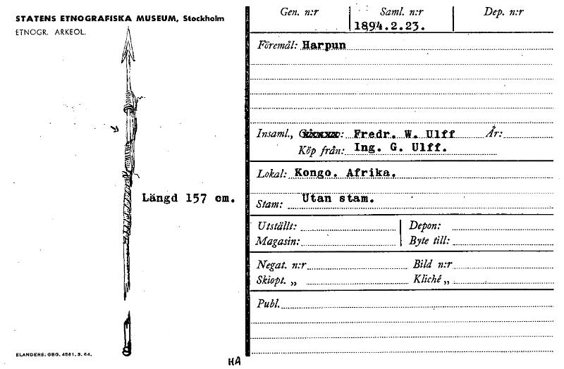 • STATENS ETNOGRAFISKA MUSEUM, Stockholm ETNOGR. ARKEOL. ELANDERS. GBG. 4861. 9. 64. Gen. n:r _ . . I - • Saml. n:r I 4E49:4.2.23. Dep. n:r Föremål: Harpun Insaml., Grix~:....Fro.dr......W......Ulff fr... Visa hela