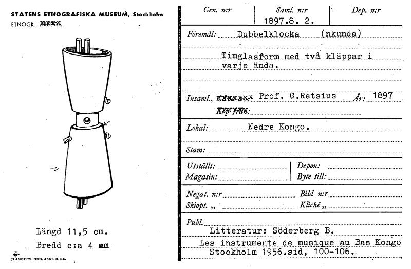 STATENS ETNOGRAFISKA MUSEUM, Stockholm ETNOGR. XRXrdP. Gen. n:r SamA mr I 1897.8. 2. Dep. mr I Föremål: Duboelklocka (nkunda) Timglasform_med.två.kläppard varje ända. hisam4 imucw Prof. G.Retsius A4: 1897 K4959fflk Lokal: Nedre Kongo. Stam: . Utställt:. Magasin: I Depon: I Byte till: Negat. n:r Bild n:r Skiopt. „ - KlicH „ • Publ. Litteratur: Söderberg B. Les instrumente de musique au Bas Kongo Stockholm 1956.sid, 100-106.. Längd 11,5 cm. Bredd c:a 4 lam 4- BLANDERS. GBG. 4561.3.64. [ocr]Stäng