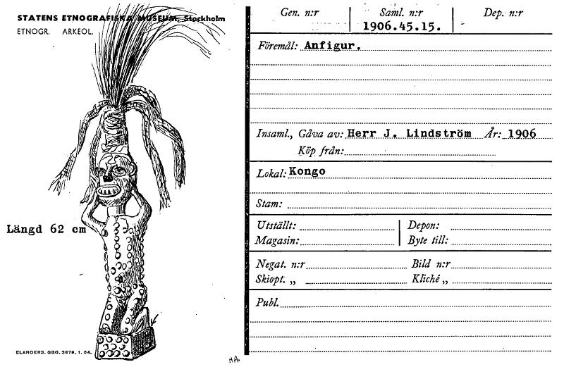 • STATENS ETNOGR kholm ETNOGR. ARKEOL. ELANDERS. GBG. 3879. 1.84. Gen. n:r — Saml. n:r 1906.45.15. Dep. n:r Föremål: An f i gur , Insaml., Gåva av: Herr J, Linds tröm År: 1906 Köp från: Lokal: Kongo... Visa hela