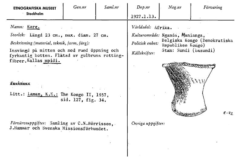 ETNOGRAFISKA MUSEET Stockholm Gen.nr Saml.nr Dep.nr 1927.1.13. Neg.nr Förvaring Världsdel: Afrika. Kulturområde: Nganda; Klanianga, - Belgiska Kongo (Demokratiska Politisk enhet: RepUbliken Korig6) Kä...