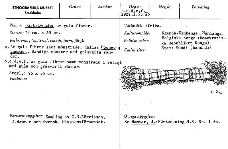 • Saml.nr Gen.nr 142/.i.35.a, bcde f. Dep.nr ETNOGRAFISKA MUSEET Stockholm Neg.nr Förvaring Namn: Bastvävnader av gula fibrer. Världsdel: Afrika. Storlek: 75 cm. x 55 cm. Kulturområde: Nganda-d(inkenge,... Visa hela