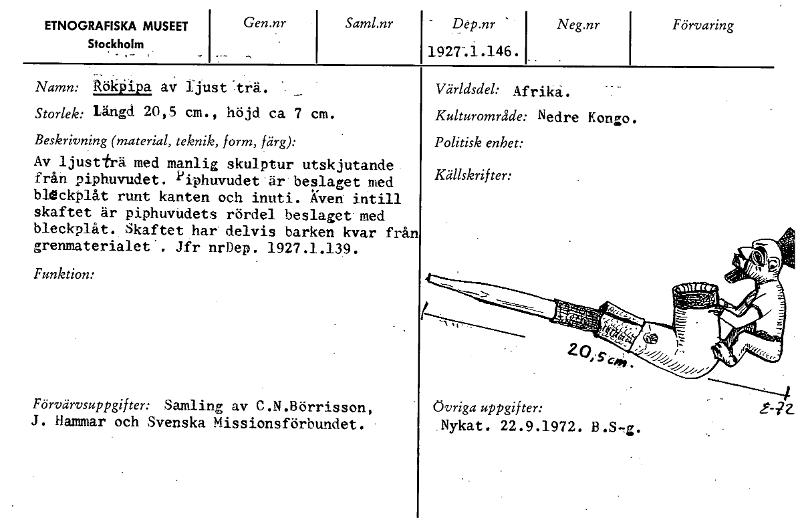 ETNOGRAFISKA MUSEET Stockholm Saml.nr Förvaring Gen.nr Dep.nr 1927-.1.1.46.1. Neg.nr Namn: Rökpipa av ljust :trä. Storlek: längd 20,5 cm., höjd ca 7 cm. Beskrivning (material, teknik, form, färg): Av ljustfrä med manlig skulptur utskjutande från piphuvudet. ijiphuvudet'är beslaget med bleckplåt runt kanten och inuti. Även intill skaftet är piphuvhdets rördel beslaget med bleckplåt. Skaftet har delvis barken kvar från grenmaterialet'. Jfr nrDep. 1927.1.139. Funktion: Förvärvsuppgifter: Samling av C.N.Börrisson, J. Hammar och Svenska Missionsförbundet. Övriga uppgifter: Nykat. 22.9.1972. B.S-g. Världsdel: Afrika. Kulturområde: Nedre Kongo. Politisk enhet: Källskrifter: [ocr]