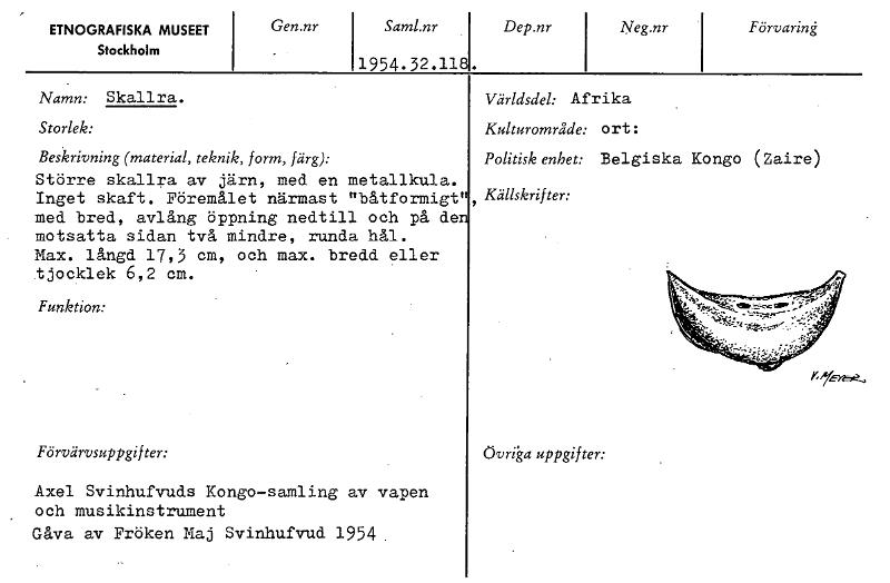 ETNOGRAFISKA MUSEET Stockholm Gen.nr Saml.nr Dep.nr 1954.32.111 Neg.nr Förvaring Namn: Skallra. Storlek: Beskrivning (material, teknik, form, färg): Större skallra av järn, med en metallkula. Inget skaft. Föremålet närmast "båtformigt" med bred, avlång öppning nedtill och på den motsatta sidan två mindre, runda hål. Max. långd 17,3 cm, och max. bredd eller tjocklek 6,2 cm. Funktion: Världsdel: Afrika Kulturområde: ort: Politisk enhet: Belgiska Kongo (Zaire) Källskrifter: Förvärvsuppgifter: Axel Svinhufvuds Kongo—samling av vapen och musikinstrument Gåva av Fröken Maj Svinhurvud 1954. Övrika uppgifter: [ocr]