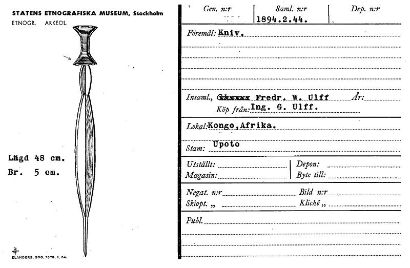 STATENS ETNOGRAFISKA MUSEUM, Stockholm ETNOGR. ARKEOL. Lägd 48 cm. Br. 5 cm. ELANDERS, GBG. 3879. 1.64. ' Gen. n:r I Saml. n:r I 1894.2.44. Dep. n:r Föremiil:Kniv, • Insaml., Gritxxxx...Fr.edr. W. .Ulff År: Köp friin:"g. G. Ulff. LokakKongolAfrika. • U Stam: poto Utställt: Magasin: I Depon: I Byte till: Negat. n:r Bild n:r Skiopt.. „ Kliché,, Publ. [ocr]