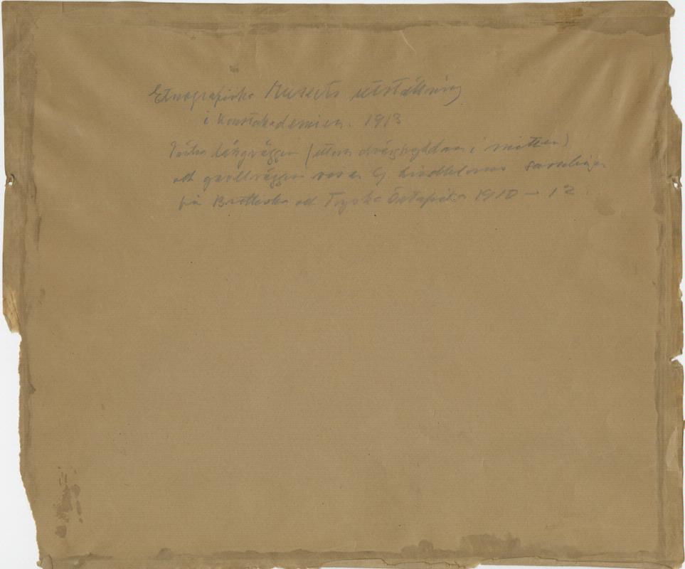 • Etnografiska museets utställning i Konstakademien 1913. Västra långväggen (dvärghyddan i mitten) och gavelväggen visar Gerhard Lindboms samlingar från Brittiska och Tyska Östafrika 1910-12.