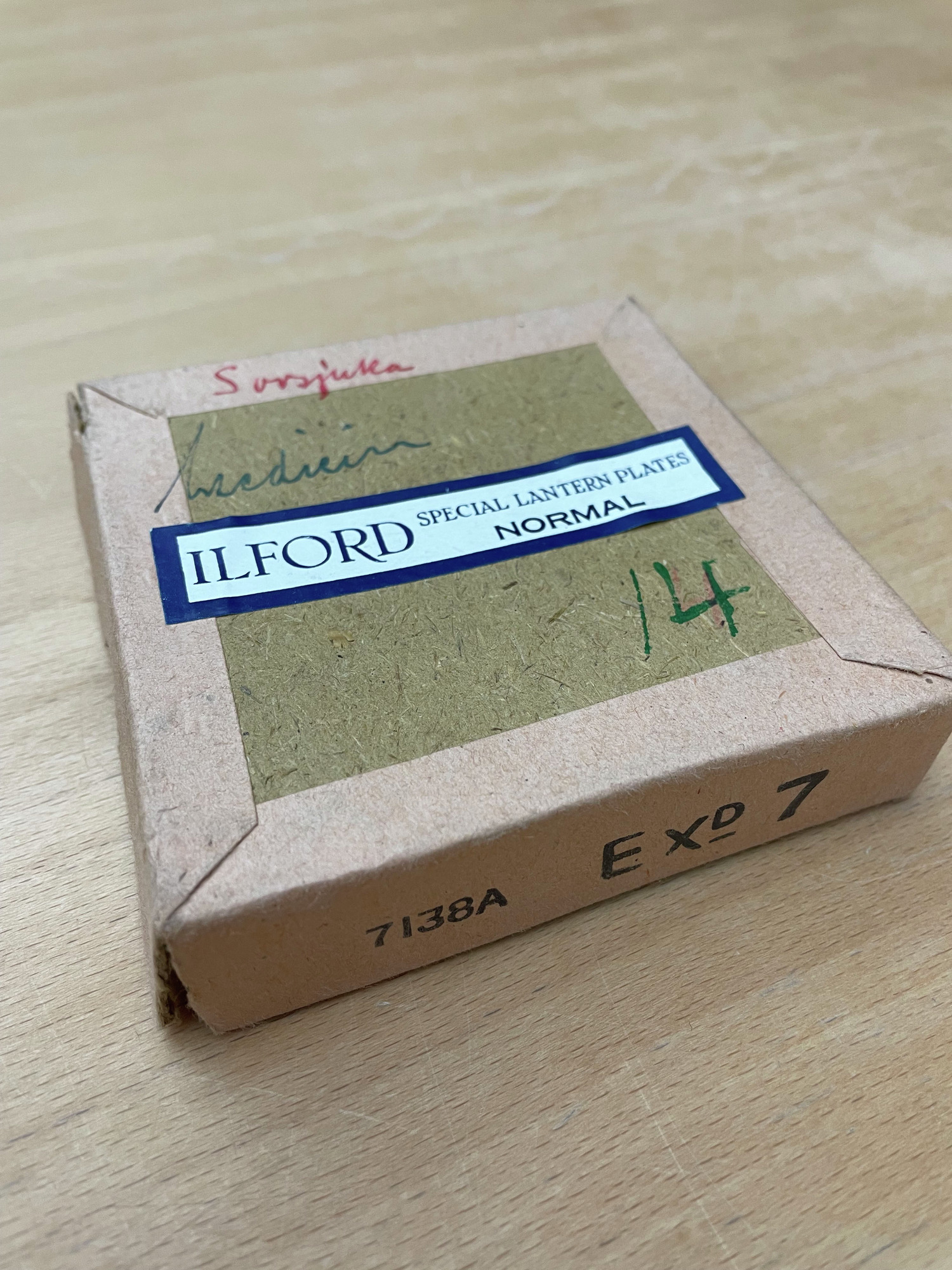 • Ask med skioptikon från Svenska missionsförbundet. Text på asken: "Sovsjuka, medicin". Ilford gaslight lantern plates.