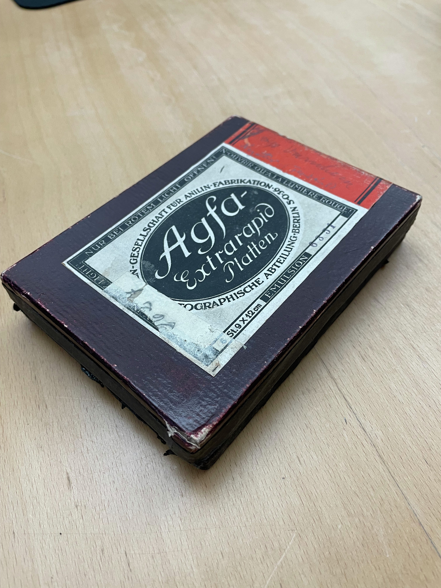 • Ask med glasnegativ från Svenska missionsförbundet. Text på asken: Agfa Exrarapid platten, 6 st 9x12 emulsion.