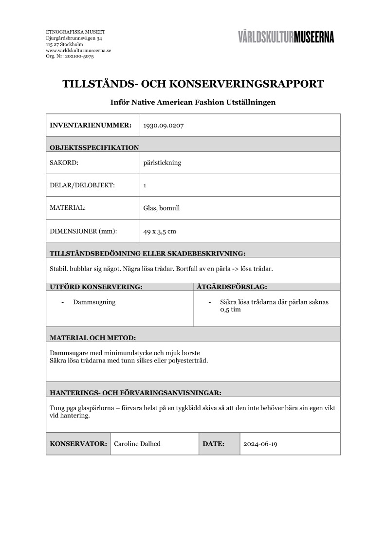 ETNOGRAFISKA MUSEET Djurgårdsbrunnsvägen 34 115 27 Stockholm www.varldskulturmuseerna.se Org. Nr: 202100-5075 TILLSTÅNDS- OCH KONSERVERINGSRAPPORT Inför Native American Fashion Utställningen INVENTARIENUMMER: 1930.09.0207 OBJEKTSSPECIFIKATION SAKORD: pärlstickning DELAR/DELOBJEKT: 1 MATERIAL: Glas, bomull DIMENSIONER (mm): 49 x 3,5 cm TILLSTÅNDSBEDÖMNING ELLER SKADEBESKRIVNING: Stabil. bubblar sig något. Några lösa trådar. Bortfall av en pärla -> lösa trådar. UTFÖRD KONSERVERING: ÅTGÄRDSFÖRSLAG: - Dammsugning - Säkra lösa trådarna där pärlan saknas 0,5 tim MATERIAL OCH METOD: Dammsugare med minimundstycke och mjuk borste Säkra lösa trådarna med tunn silkes eller polyestertråd. HANTERINGS- OCH FÖRVARINGSANVISNINGAR: Tung pga glaspärlorna – förvara helst på en tygklädd skiva så att den inte behöver bära sin egen vikt vid hantering. KONSERVATOR: Caroline Dalhed DATE: 2024-06-19 ETNOGRAFISKA MUSEET Djurgårdsbrunnsvägen 34 115 27 Stockholm www.varldskulturmuseerna.se Org. Nr: 202100-5075 FOTOSStäng