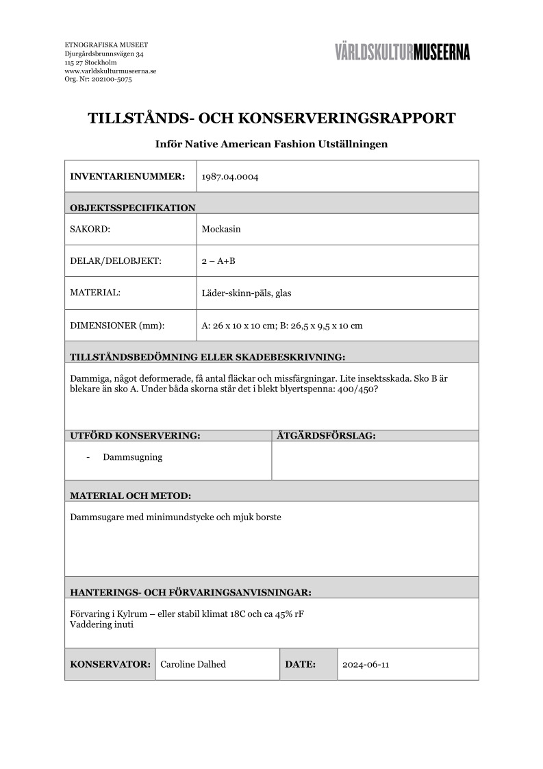 ETNOGRAFISKA MUSEET Djurgårdsbrunnsvägen 34 115 27 Stockholm www.varldskulturmuseerna.se Org. Nr: 202100-5075 TILLSTÅNDS- OCH KONSERVERINGSRAPPORT Inför Native American Fashion Utställningen INVENTARIENUMMER: 1987.04.0004 OBJEKTSSPECIFIKATION SAKORD: Mockasin DELAR/DELOBJEKT: 2 – A+B MATERIAL: Läder-skinn-päls, glas DIMENSIONER (mm): A: 26 x 10 x 10 cm; B: 26,5 x 9,5 x 10 cm TILLSTÅNDSBEDÖMNING ELLER SKADEBESKRIVNING: Dammiga, något deformerade, få antal fläckar och missfärgningar. Lite insektsskada. Sko B är blekare än sko A. Under båda skorna står det i blekt blyertspenna: 400/450? UTFÖRD KONSERVERING: ÅTGÄRDSFÖRSLAG: - Dammsugning MATERIAL OCH METOD: Dammsugare med minimundstycke och mjuk borste HANTERINGS- OCH FÖRVARINGSANVISNINGAR: Förvaring i Kylrum – eller stabil klimat 18C och ca 45% rF Vaddering inuti KONSERVATOR: Caroline Dalhed DATE: 2024-06-11 ETNOGRAFISKA MUSEET Djurgårdsbrunnsvägen 34 115 27 Stockholm www.varldskulturmuseerna.se Org. Nr: 202100-5075 FOTOS Mockasin A ETNOGRAFISKA MUSEET Djurgårdsbrunnsvägen 34 115 27 Stockholm www.varldskulturmuseerna.se Org. Nr: 202100-5075 ETNOGRAFISKA MUSEET Djurgårdsbrunnsvägen 34 115 27 Stockholm www.varldskulturmuseerna.se Org. Nr: 202100-5075 Mockasin B ETNOGRAFISKA MUSEET Djurgårdsbrunnsvägen 34 115 27 Stockholm www.varldskulturmuseerna.se Org. Nr: 202100-5075 ETNOGRAFISKA MUSEET Djurgårdsbrunnsvägen 34 115 27 Stockholm www.varldskulturmuseerna.se Org. Nr: 202100-5075Stäng