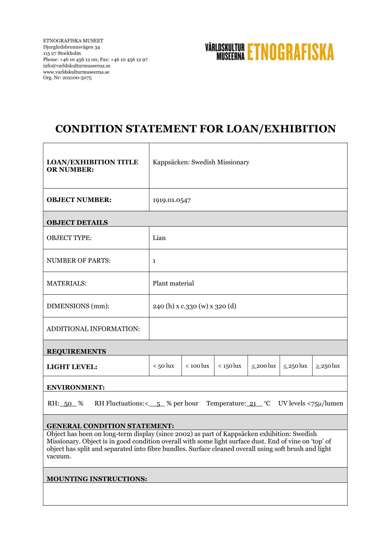 ETNOGRAFISKA MUSEET Djurgårdsbrunnsvägen 34 115 27 Stockholm Phone: +46 10 456 12 00, Fax: +46 10 456 12 97 infoldskulturmuseerna.se www.varldskulturmuseerna.se Org. Nr: 202100-5075 CONDITION STATEMENT FOR LOAN/EXHIBITION LOAN/EXHIBITION TITLE OR NUMBER: Kappsäcken: Swedish Missionary OBJECT NUMBER: 1919.01.0547 OBJECT DETAILS OBJECT TYPE: Lian NUMBER OF PARTS: 1 MATERIALS: Plant material DIMENSIO...Visa hela