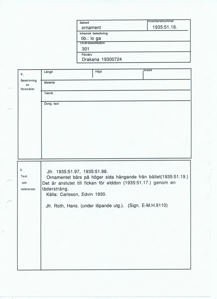 • Blankett ur Etnografiska museets arkiv.