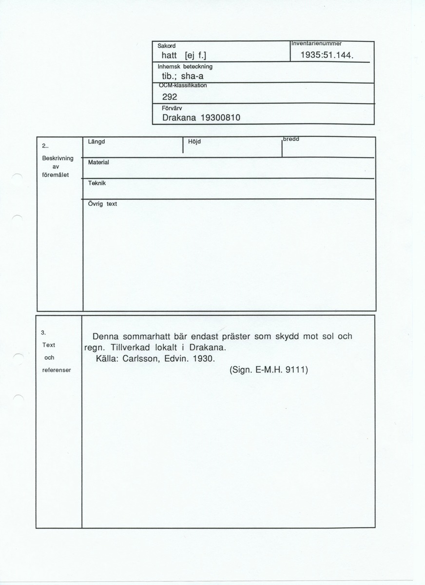 • Blankett ur Etnografiska museets arkiv.