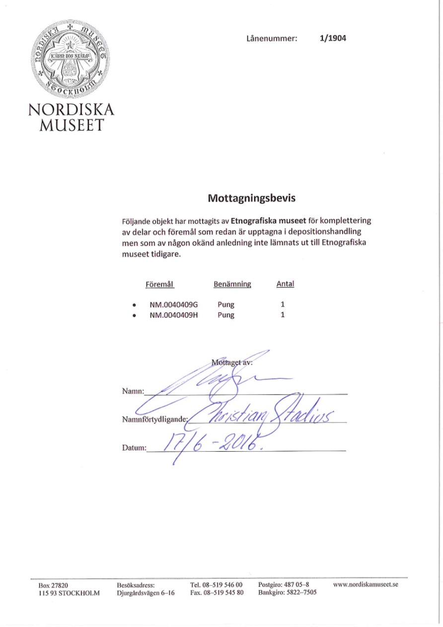 Följande objekt har mottagits av Etnografiska museet för komplettering av delar och föremål som redan är upptagna i depositionshandling men som av någon okänd anledning inte lämnats ut till Etnografiska museet tidigare.
