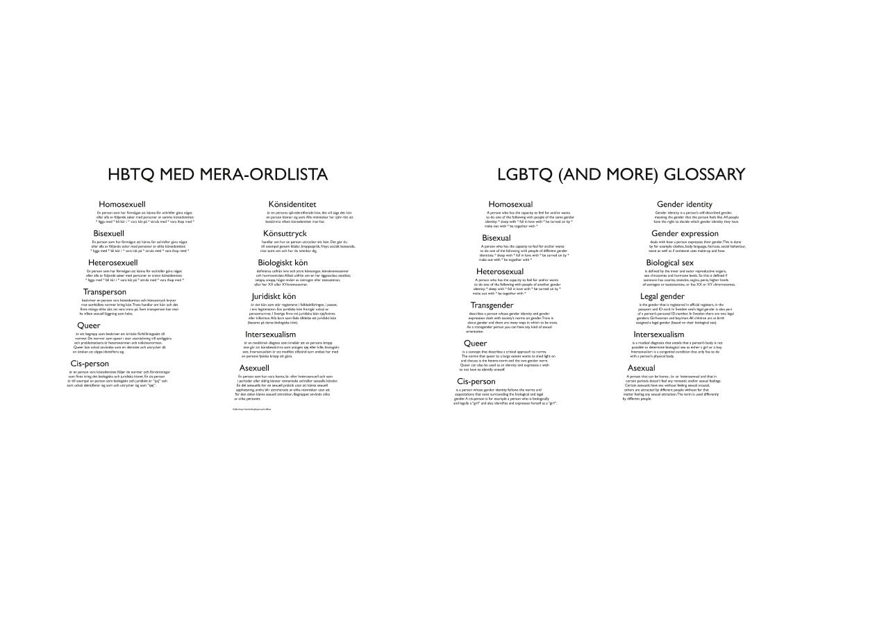 Homosexuell En person som har förmågan att känna för och/eller göra något eller alla av följande saker med personer av samma könsidentitet: * ligga med * bli kär i * vara kåt på * strula med * vara ihop med * Bisexuell En person som har förmågan att känna för och/eller göra något eller alla av följande saker med personer av olika könsidentitet: * ligga med * bli kär i * vara kåt på * strula med * vara ihop med * Heterosexuell En person som har förmågan att känna för och/eller göra något eller alla av följande saker med personer av annan könsidentitet: * ligga med * bli kär i * vara kåt på * strula med * vara ihop med * Transperson beskriver en person vars könsidentitet och könsuttryck bryter mot samhällets normer kring kön. Trans handlar om kön och det finns många olika sätt att vara trans på. Som transperson kan man ha vilken sexuell läggning som helst. Queer är ett begrepp som beskriver ett kritiskt förhållningssätt till normer. De normer som queer i stor utsträckning vill synliggöra och problematisera är heteronormen och tvåkönsnormen. Queer kan också användas som en identitet och uttrycker då en önskan att slippa identifiera sig. Cis-person är en person vars könsidentitet följer de normer och förväntningar som finns kring det biologiska och juridiska könet. En cis-person är till exempel en person som biologiskt och juridiskt är ”tjej” och som också identifierar sig som och uttrycker sig som ”tjej”. Könsidentitet är en persons självidentifierade kön, det vill säga det kön en person känner sig som. Alla människor har själv rätt att bestämma vilken könsidentitet man har. Könsuttryck handlar om hur en person uttrycker sitt kön. Det gör du till exempel genom kläder, kroppsspråk, frisyr, socialt beteende, röst samt om och hur du sminkar dig.