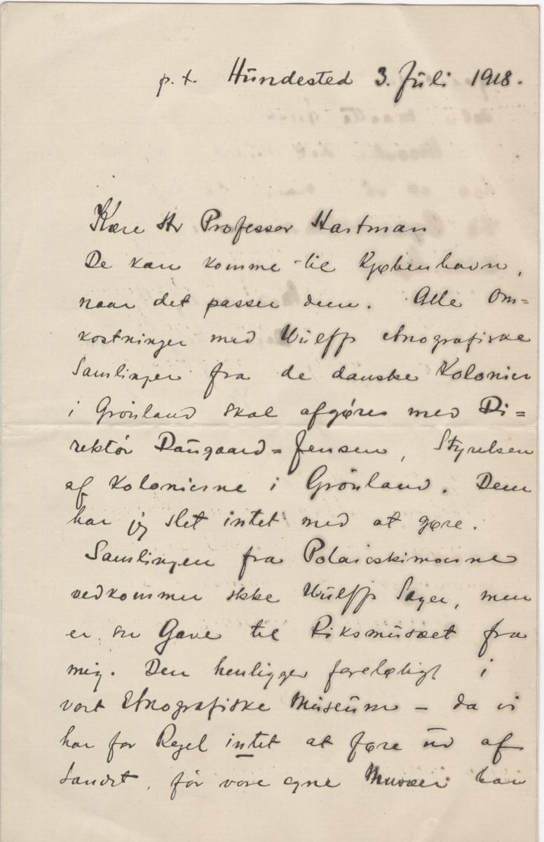 Du kan komma till Köpenhamn när passar dig. Alla omkostnader med Wulffs etnografiska samlingar från den danska kolonin på Grönland ska avgå (?) med ...Styrelsen för kolonin på ...