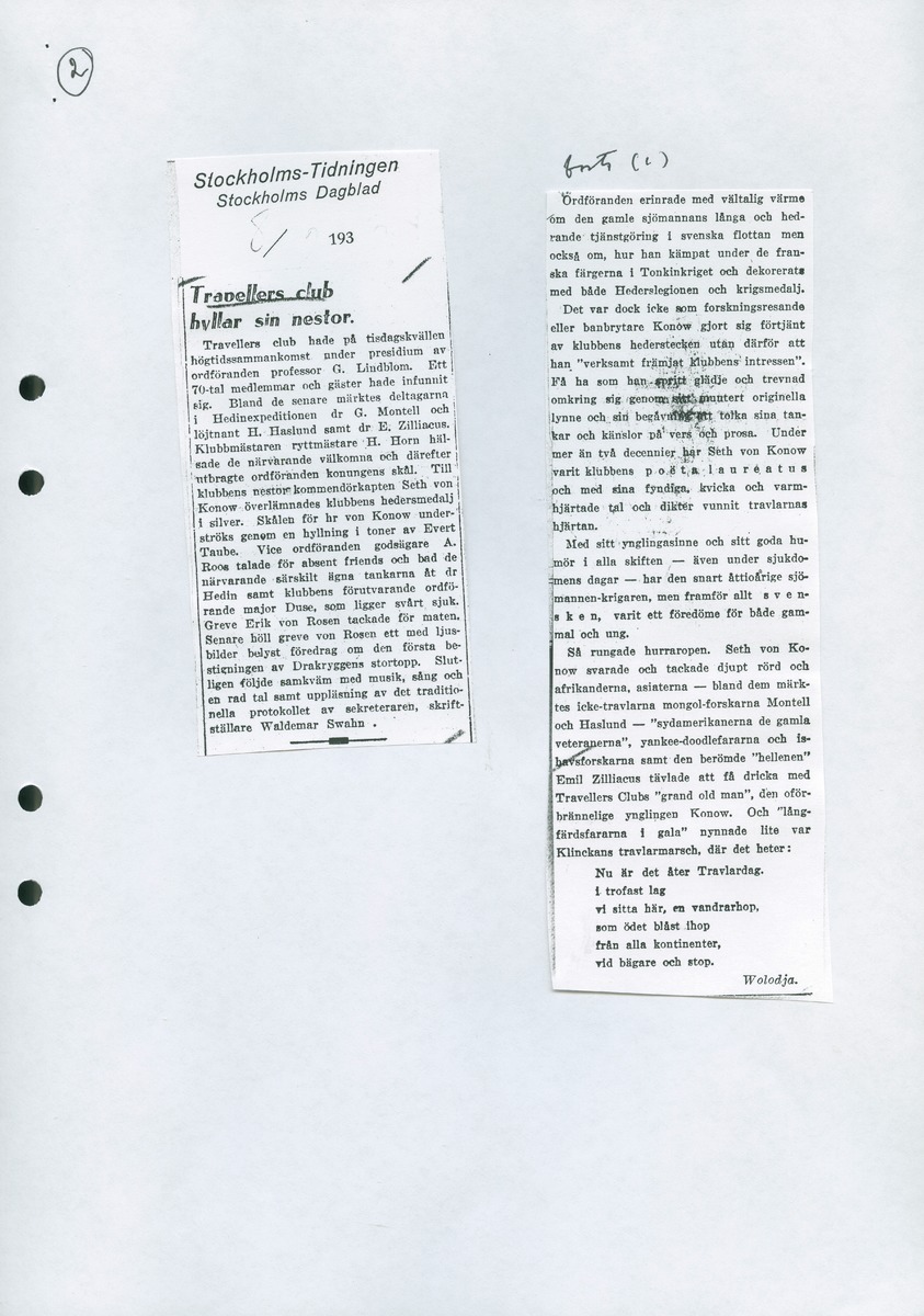 • Sida ur pärm för samlingen Travellers Club, 1984.05.