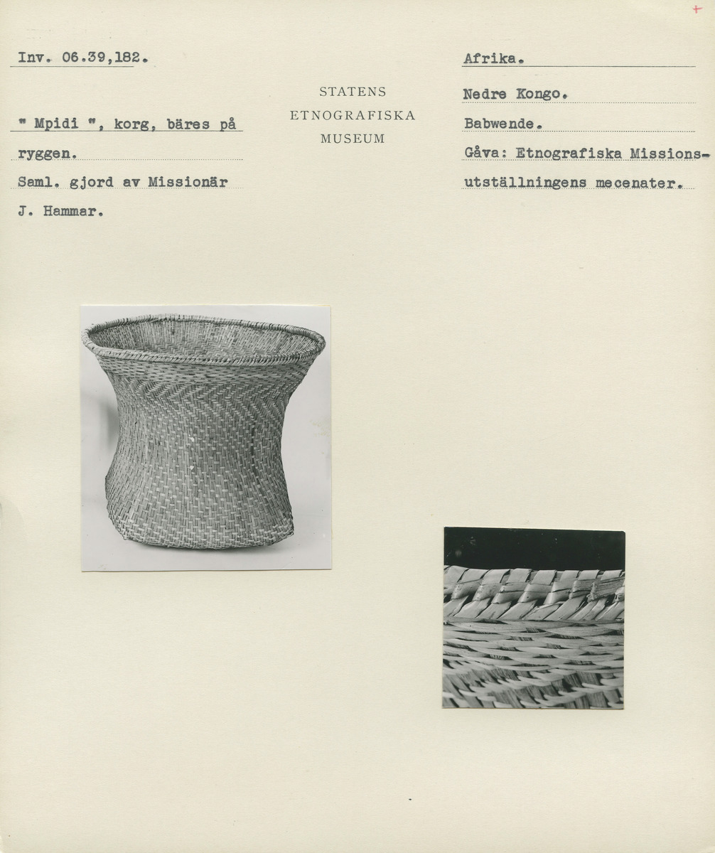 • Katalogkort ur Etnografiska museets arkiv. Dokumentation av föremålssamling.