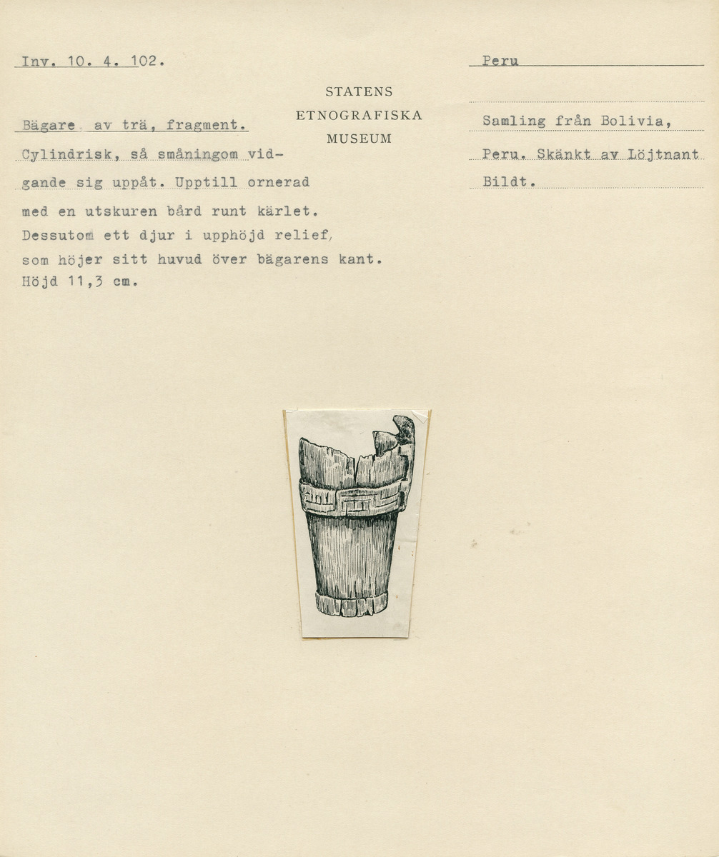 • Katalogkort för teckning av föremål ur Etnografiska museets arkiv.