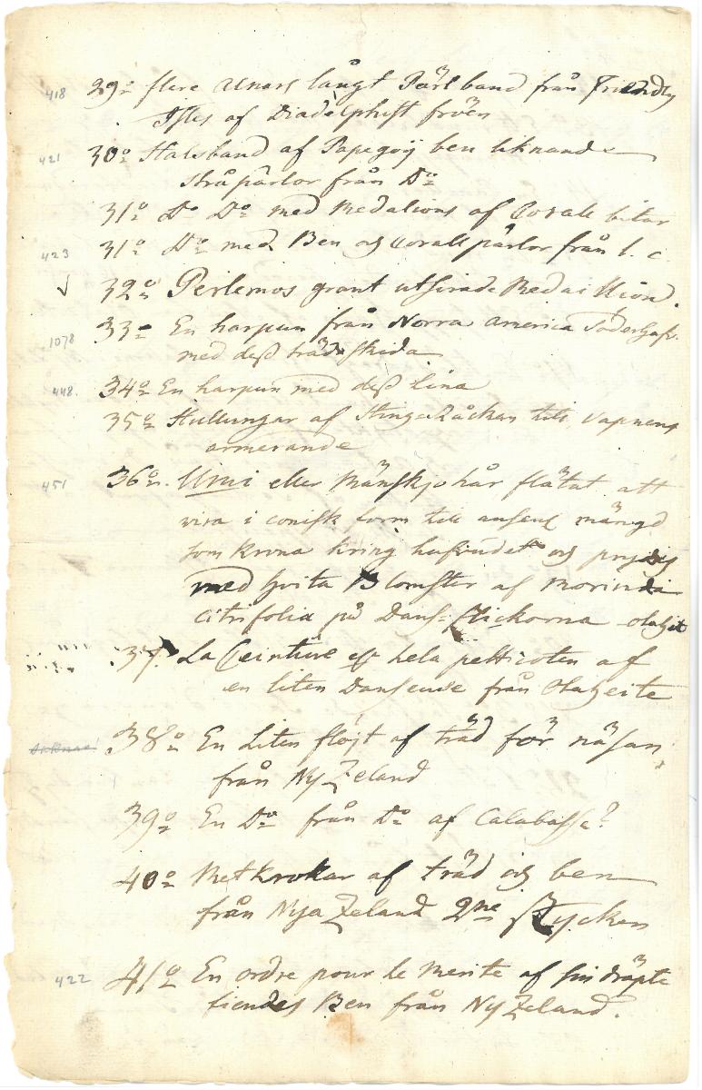 • Förteckning över föremål i Sparrmans samling, sannolikt gjord av Sparrman själv enligt blyertsnotering på första sidan. Riksmuseinummer (RM-nummer) är tillagda med blyerts för vissa av föremålen.