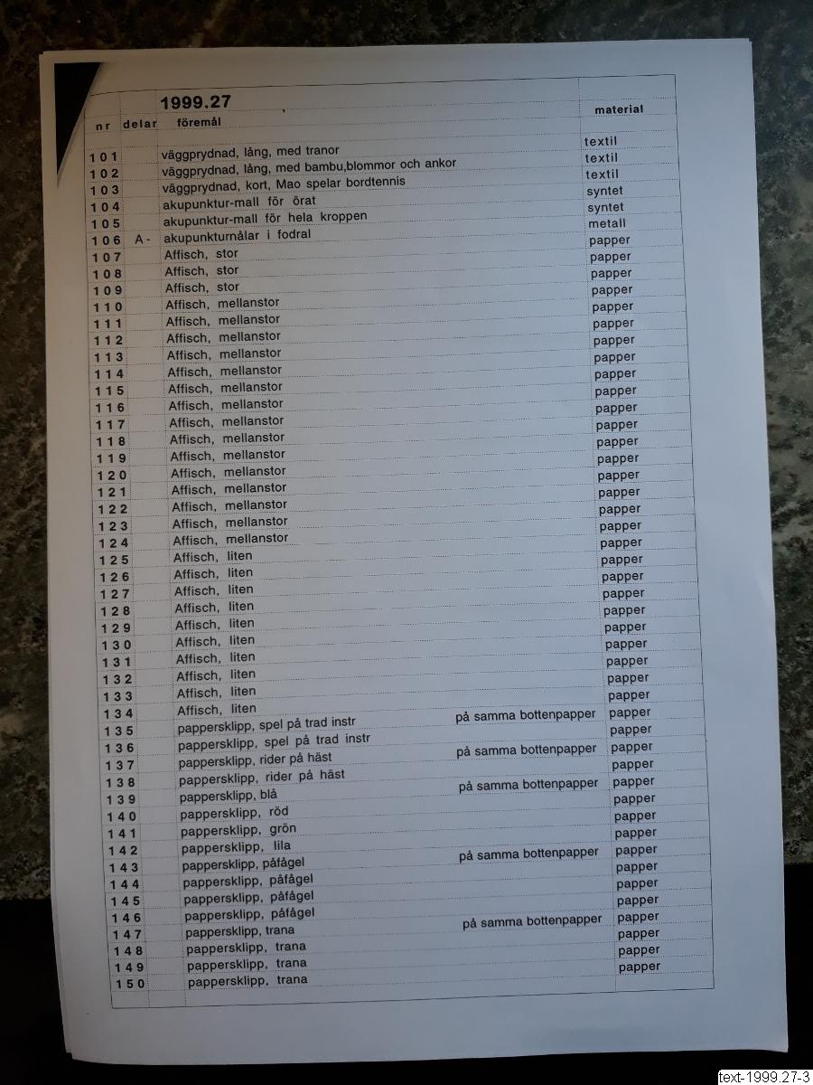 • kortfattade beskrivning av objekten till samling 1999.27