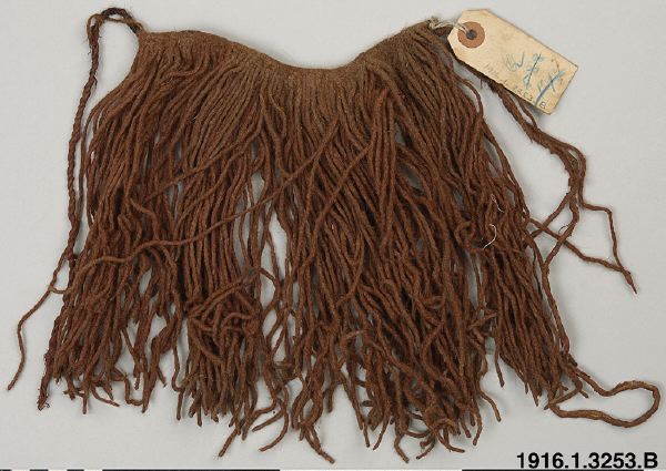 Kvinnoskört enligt katalog. ¿Womens apron¿ enligt omslagspapper, även annan text på denna (se i arkivet) samt på vidhängande etikett på föremålet. Skört att hänga över blygd, av växtfibersnoddar hängande i knytband av ? , skörten är sedan ockrafärgad.