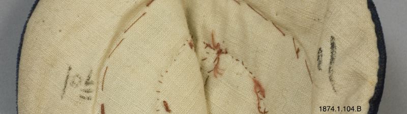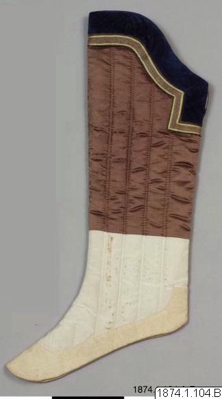 • Sockorna är sydda av beige bomullstyg, vadderade och har längsgående stickningar. De är förstärkta i sulan med små stygn.