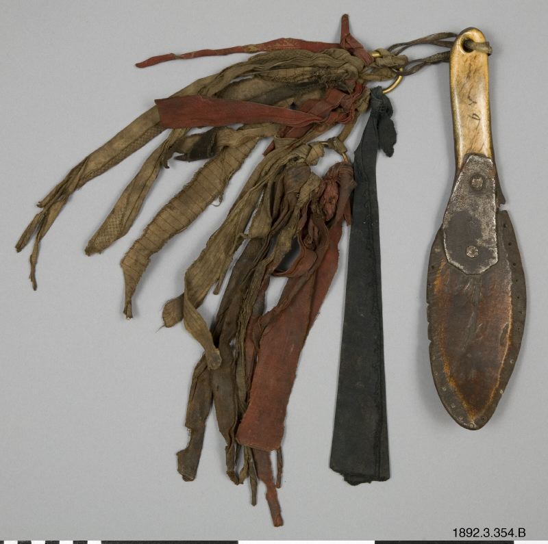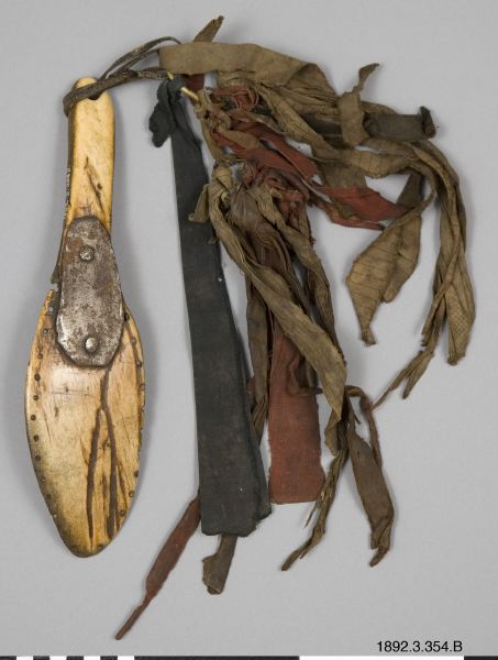 Spadformad trumpinne av ben eller horn. I änden av handtaget är en läderrem fästad, vari det sitter en metallring med olikfärgade tygband (röda, bruna, svarta). Trumpinnen har ett gammalt brott som är lagat med en metallbit som är fästad med nitar på båda sidor.