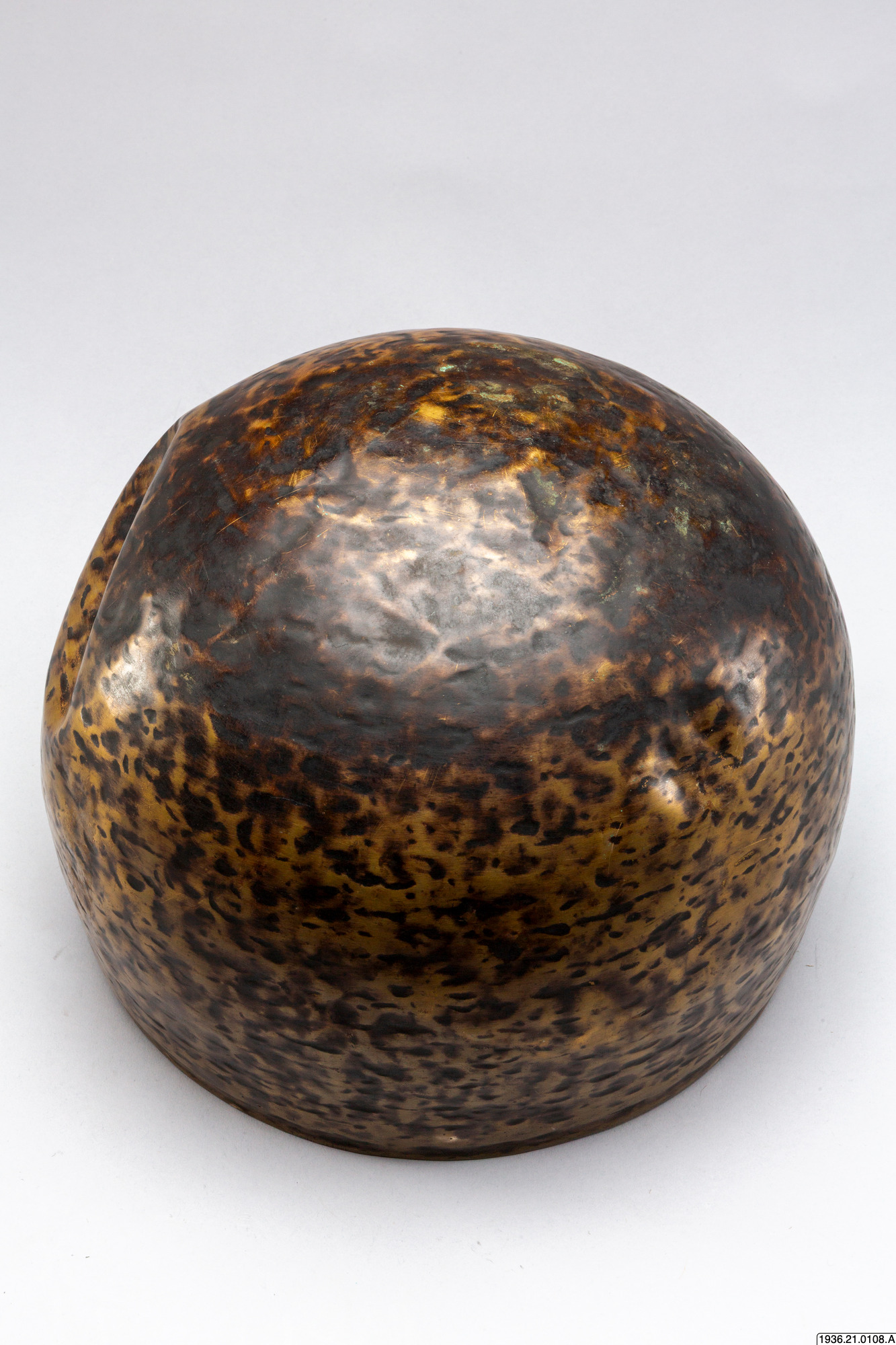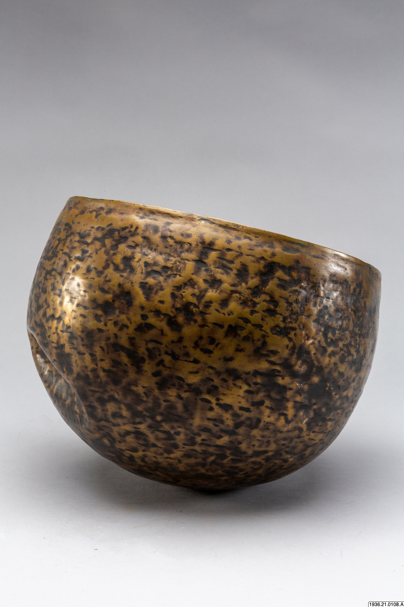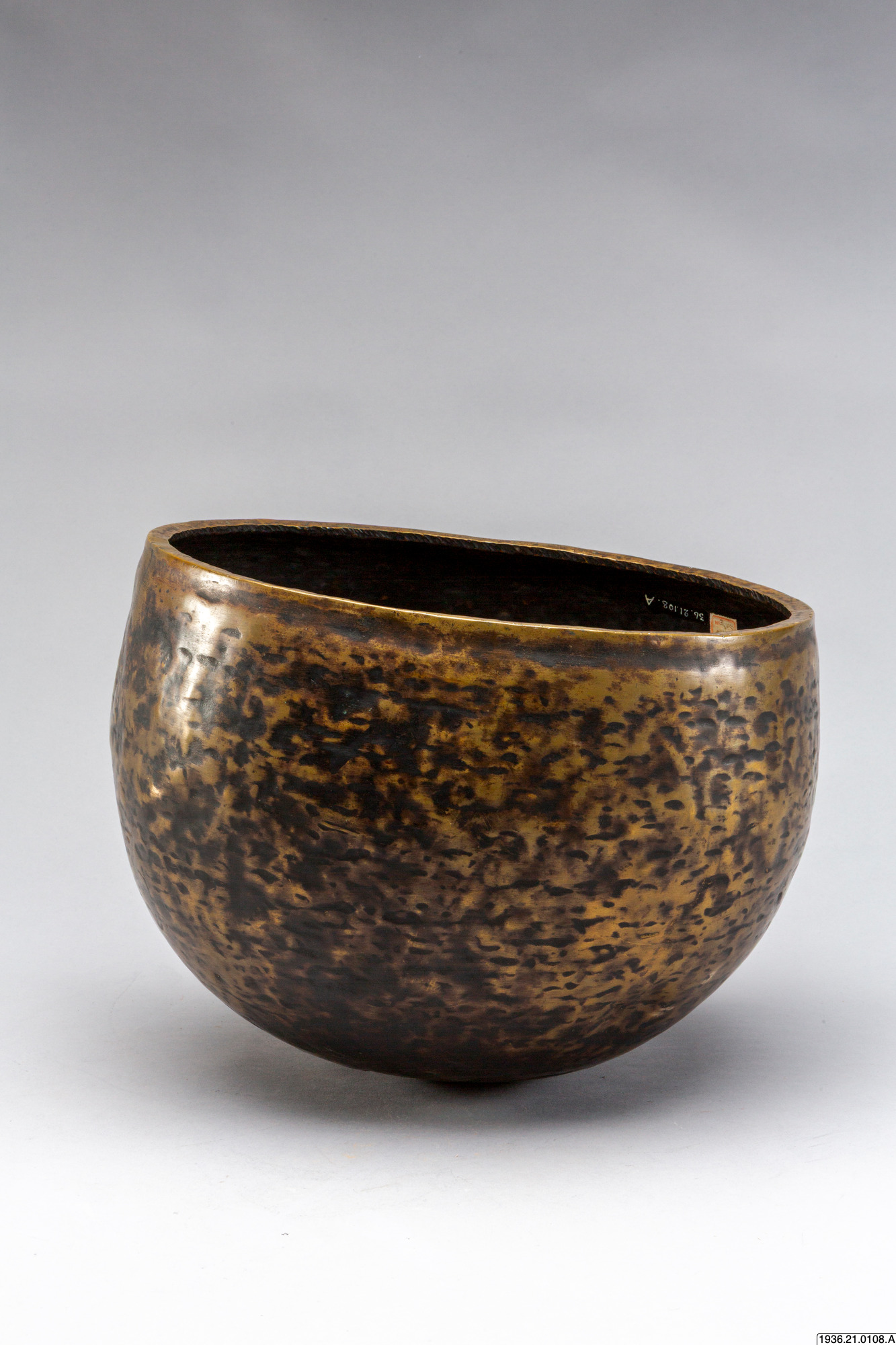 Gryttumma av brons. Som dekoration djupa märken efter uppdrivningen. En gammal skada i form av inåtvända bucklor.