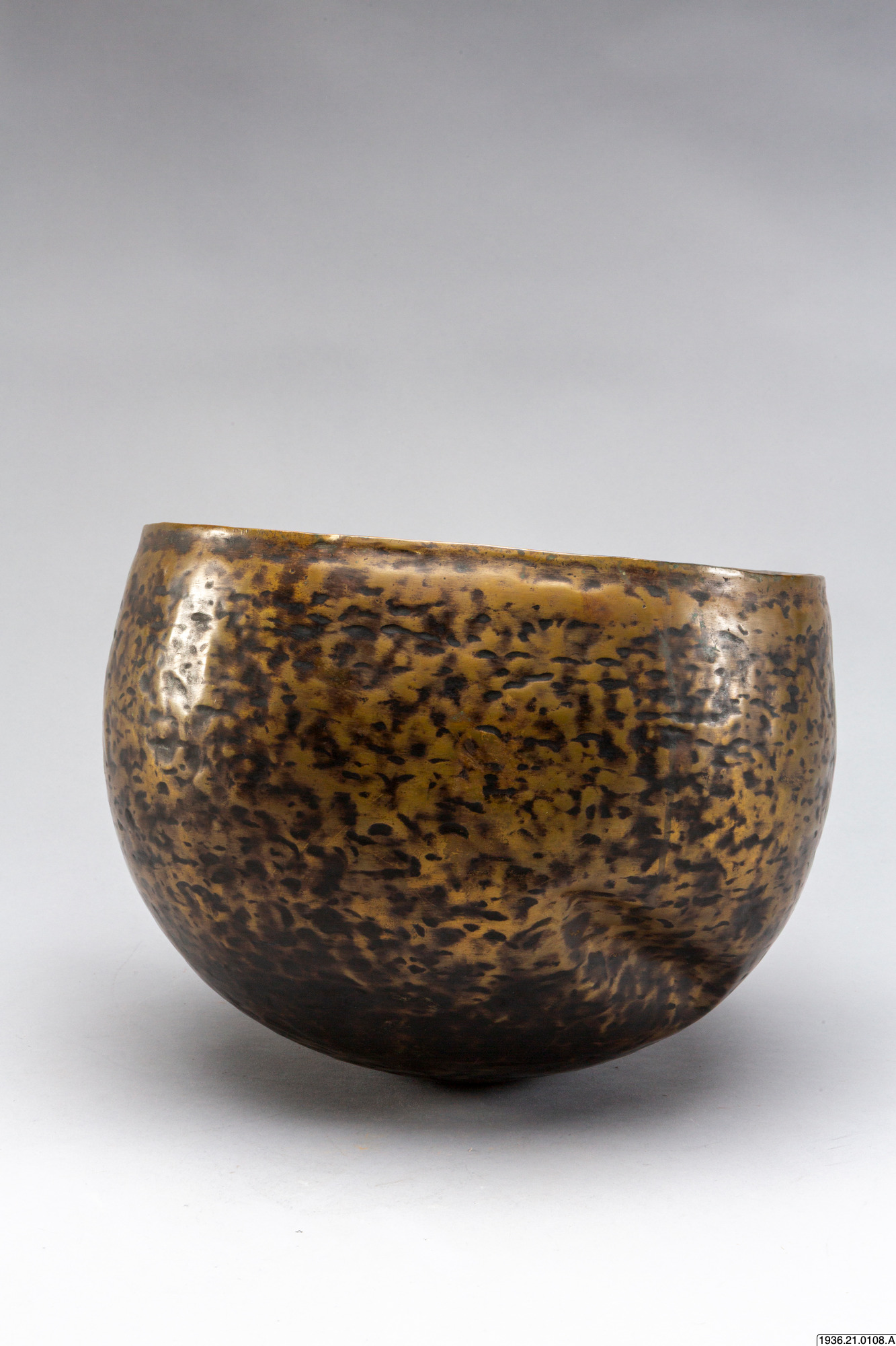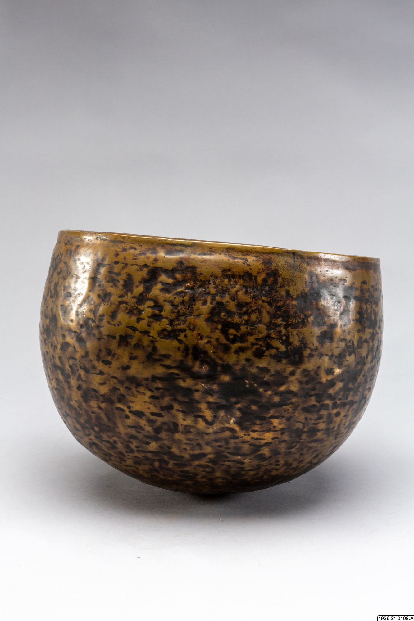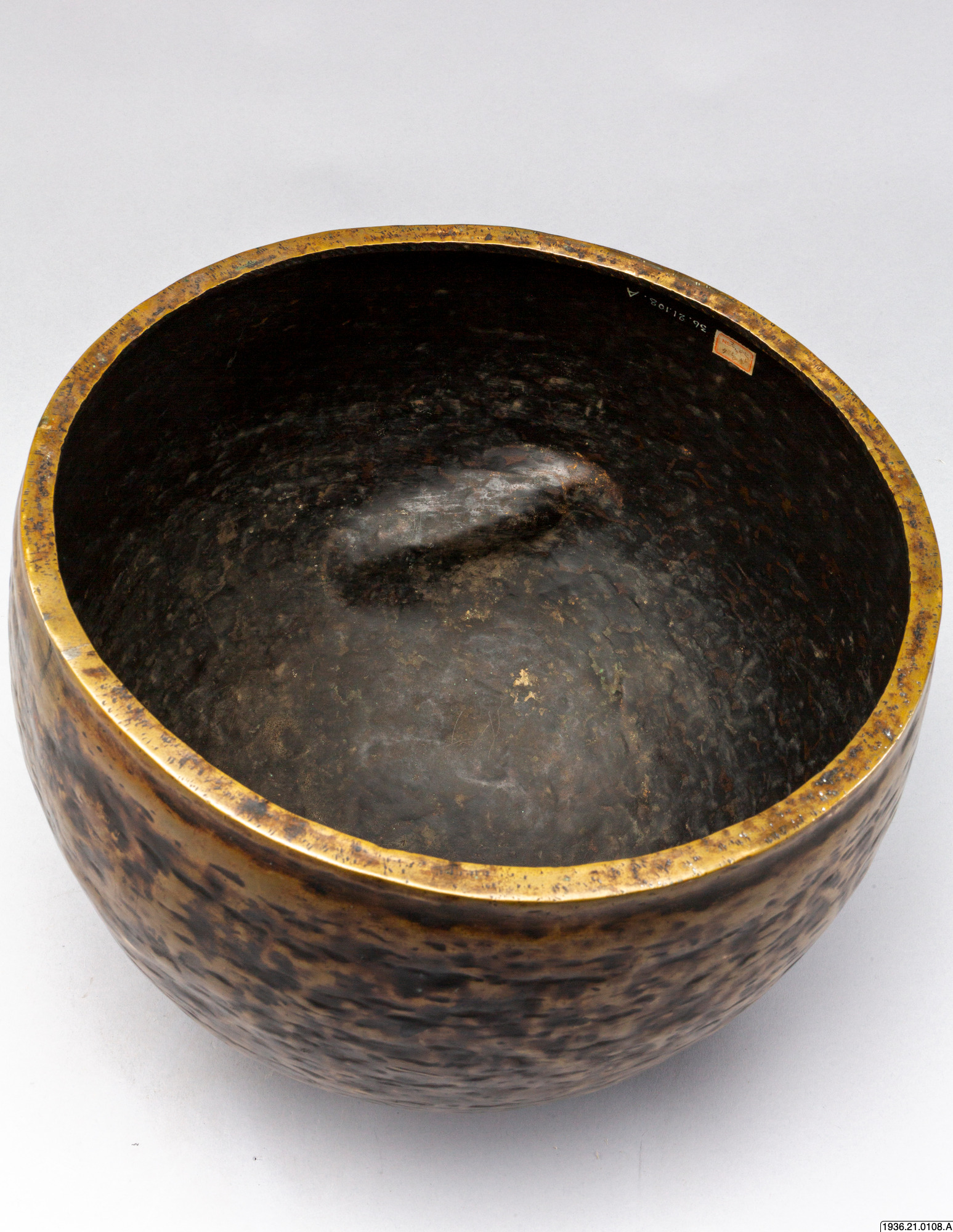 Gryttumma av brons. Som dekoration djupa märken efter uppdrivningen. En gammal skada i form av inåtvända bucklor.