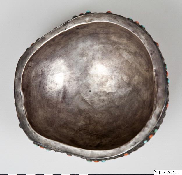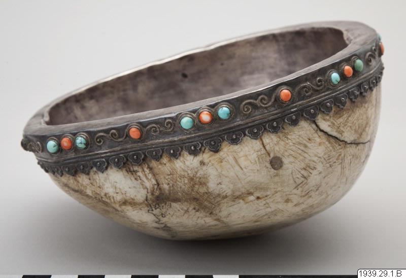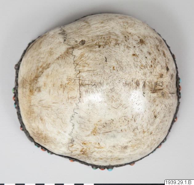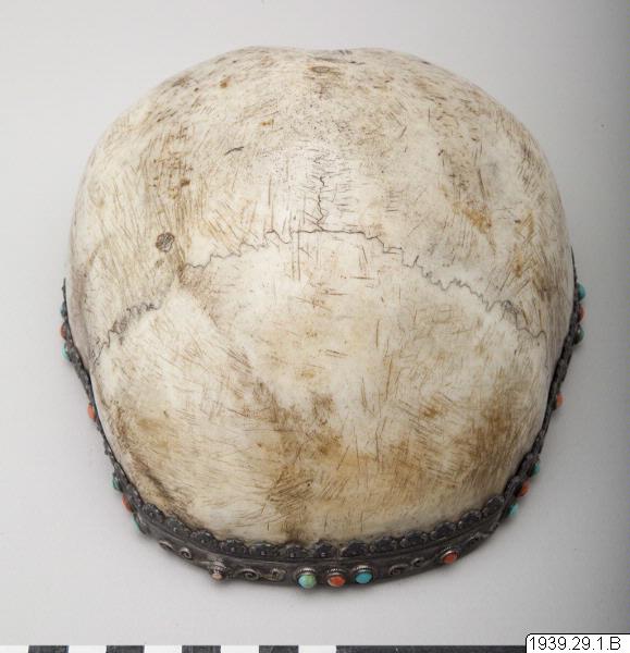 • Offerskål, kapala, tillverkad av ett människokranium, vars översida är slipad och glättad. Insidan klädd med silver. Längs kanten en bård av silver med drivna ornament och filigranslingor samt infattade turkoser och koraller. (generalkatalogen)
