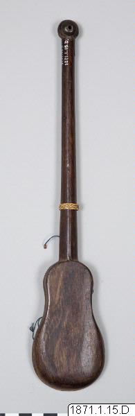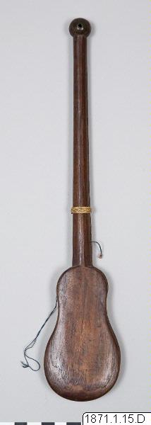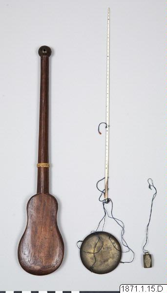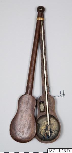 • Fodral till våg. Fiolformat fodral av trä, i två delar men sammanfogade med metall. Ett "lås" av flatad bambu. (AU)